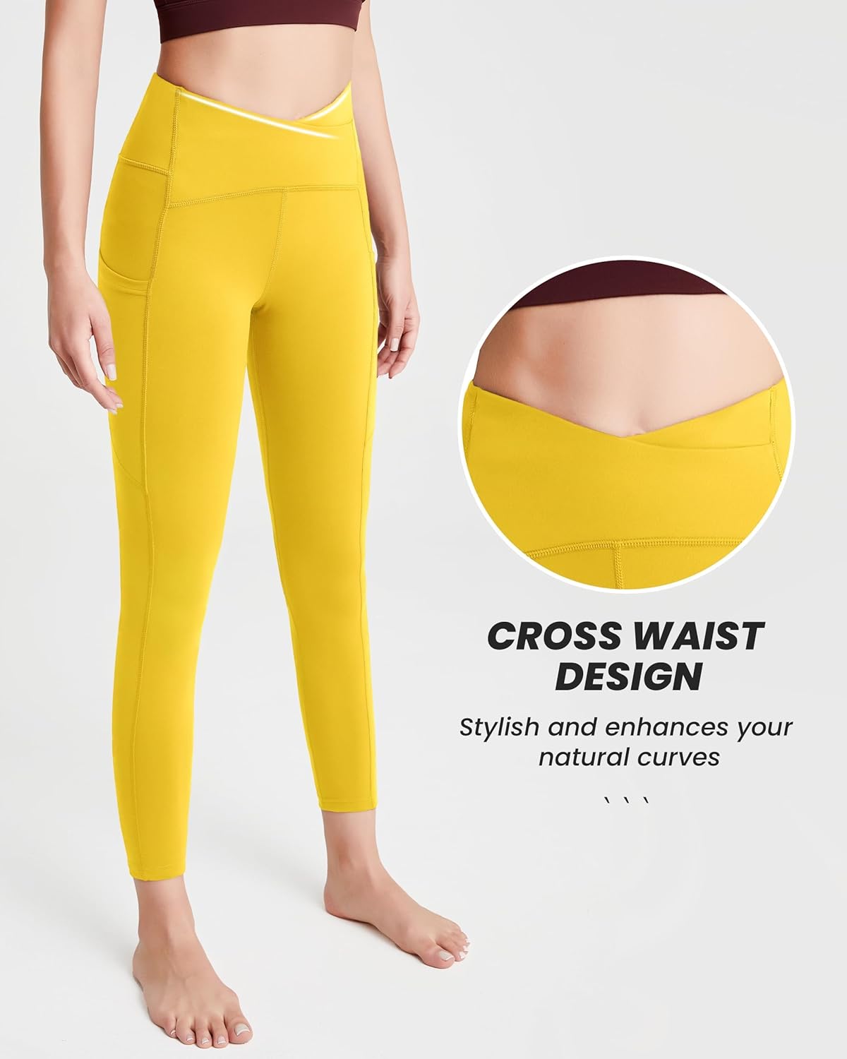 QUEENIEKE Cross Waist Workout Leggings for Women – Crossover High Waisted Tummy Control Yoga Pants for Women with 2 Pockets