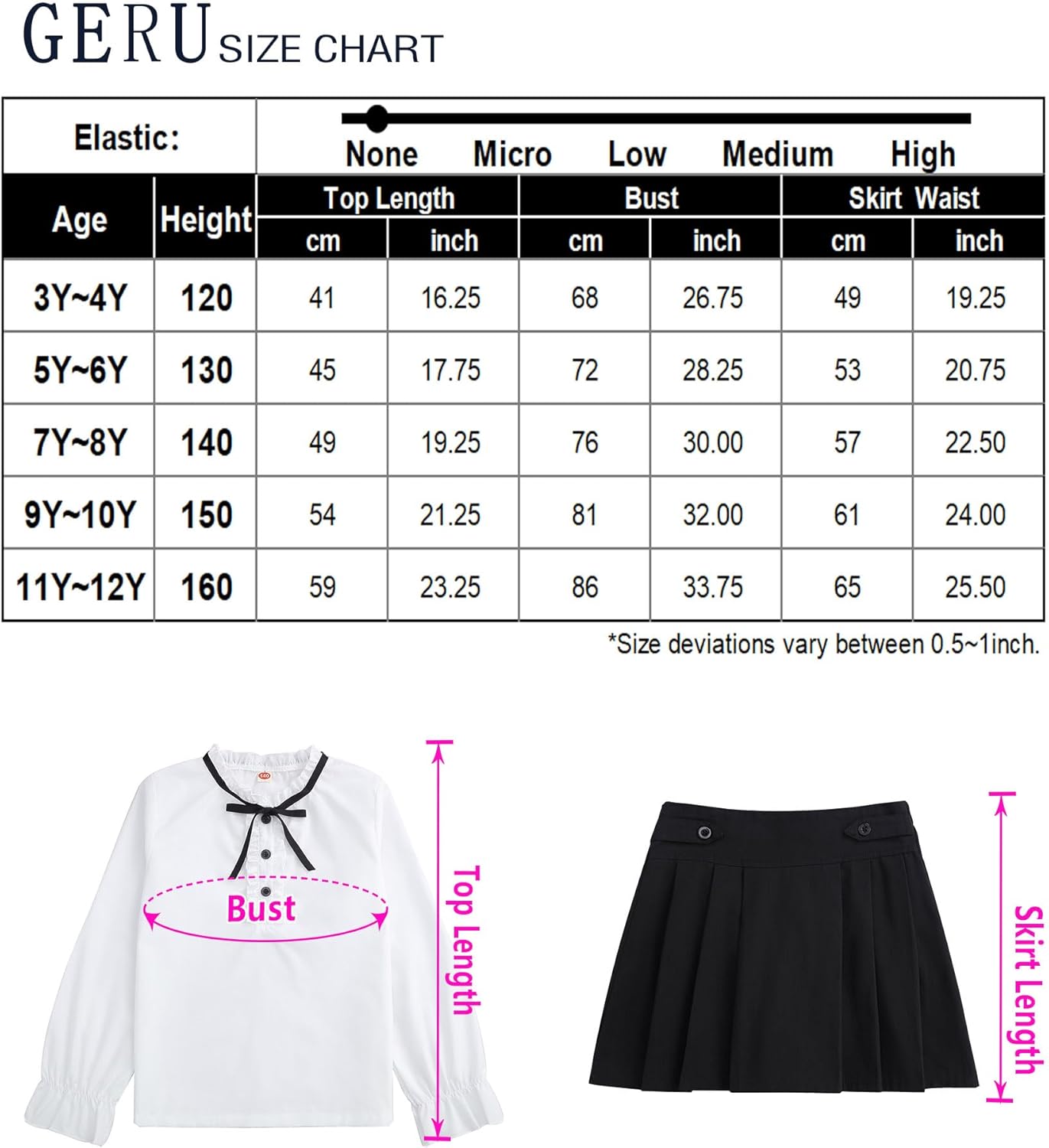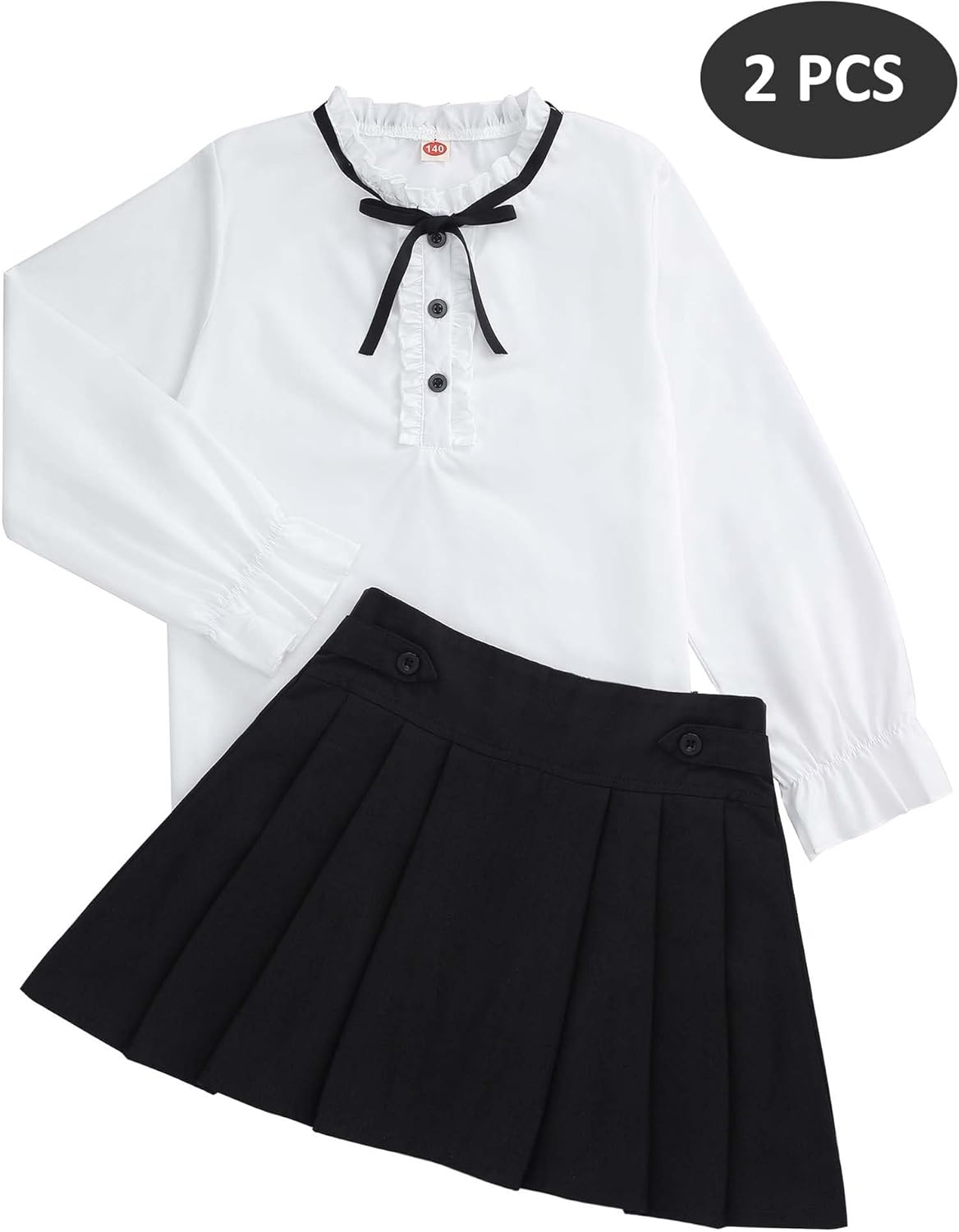 Girls White Blouse Ruffle Long Sleeve Button Down Shirt and Pleated Skirt School Uniform 2 Piece Outfit Set 3-12Y