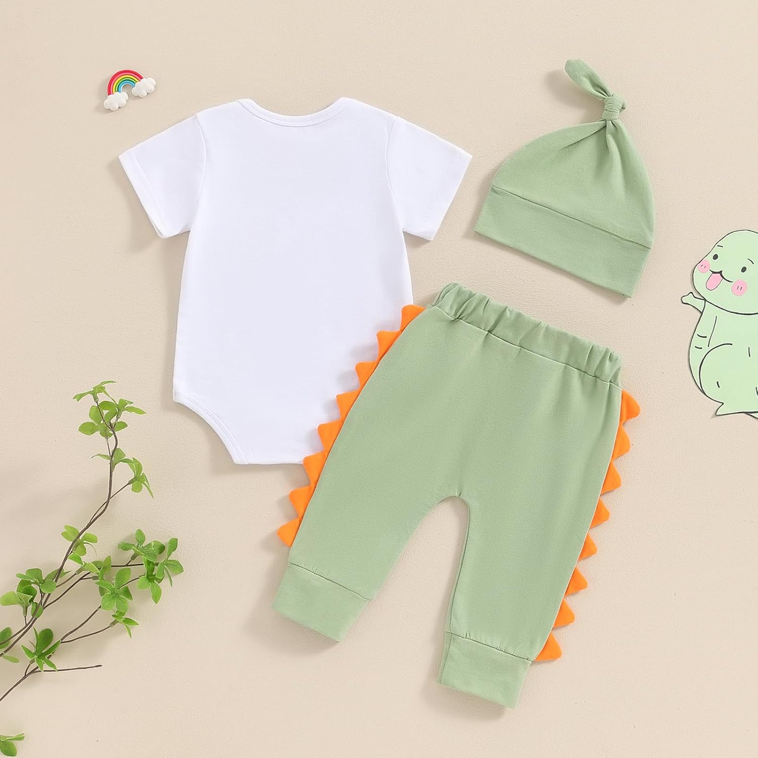 Omkzanbi Newborn Baby Boy Summer Clothes I’m New Here Dinosaur Bodysuit Green Jogger Pants Hat Cute 3Pcs Coming Home Outfit