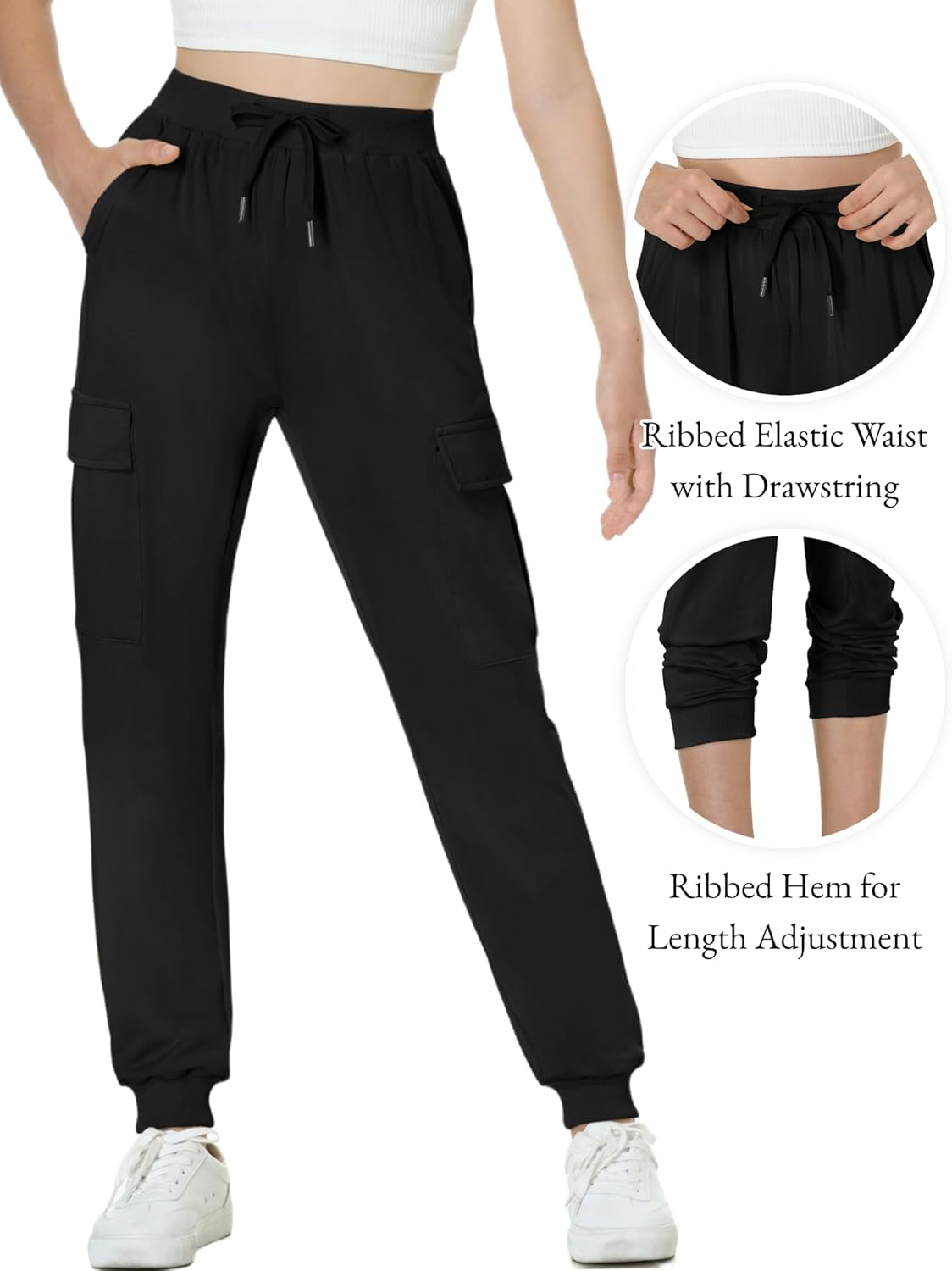 EXARUS Girls Cargo Pants Joggers Slim Fit with Zip Pockets Kids Quick Dry Lightweight Drawstring High Waisted 8-14Y