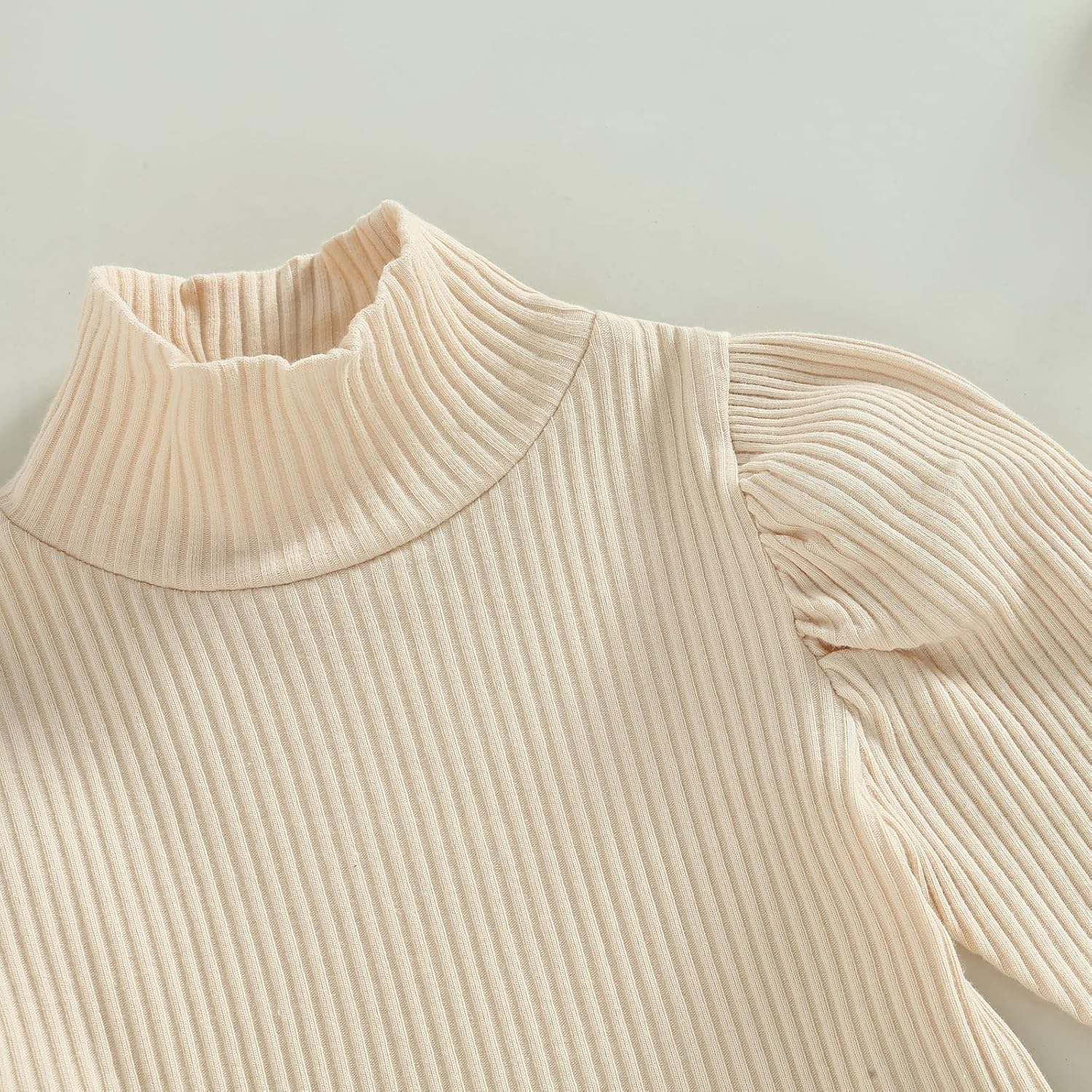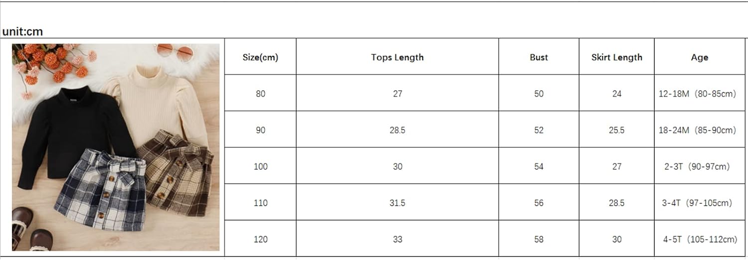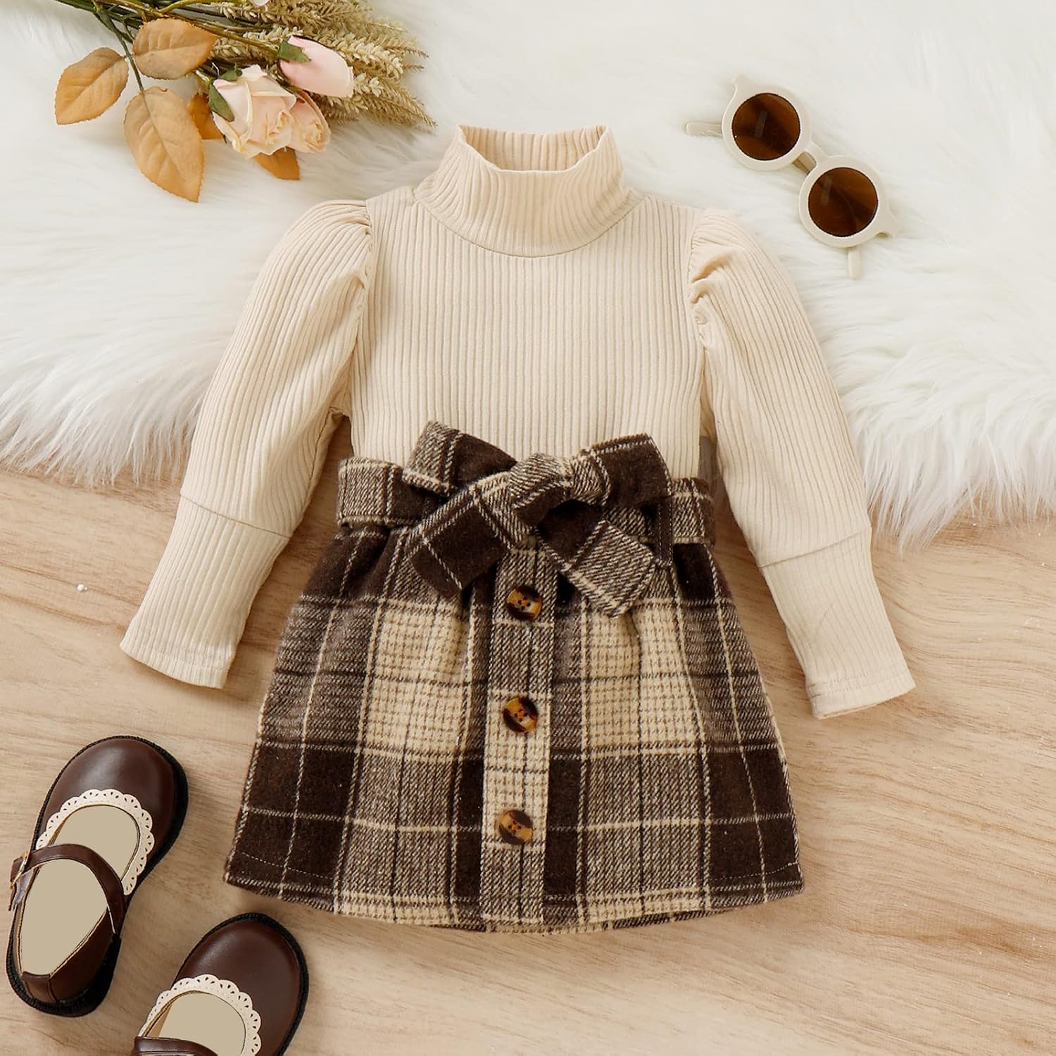 Fernvia Toddler Baby Girl Fall Winter Skirt Set Turtleneck Ribbed Long Sleeve T-Shirt Top & Plaid Skirts Dress 2Pcs Outfits