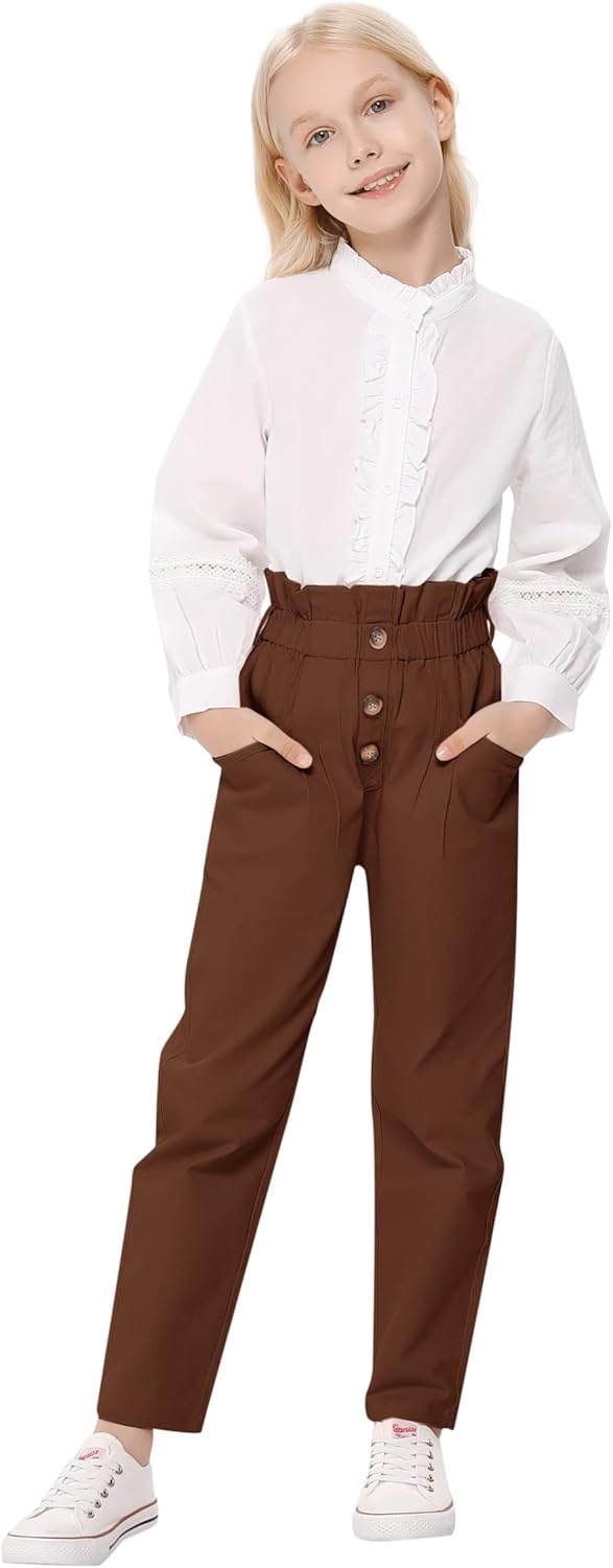 Kukume Girls Pants Lettuce Trim High Waist Casual Button Front Trousers 3-12 Years.