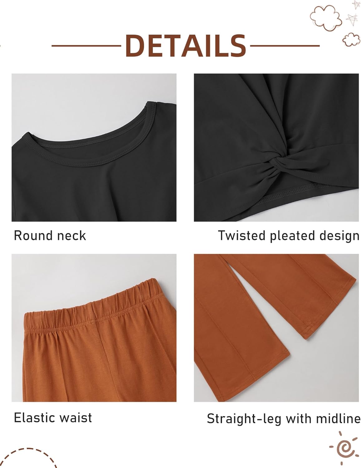 Girls Fall Outfits Fashion Solid Long Sleeve Twist Crop Tops and Wide Leg Pants Girls Clothing Set