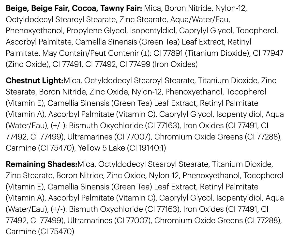 COVERAGE: Triple-milled minerals offer that flexible, buildable coverage, for a radiant, second-skin finish without any dryness, cakiness, or flashback. Suitable for all skin types. Ideal for sensitive or post-treatment skin.