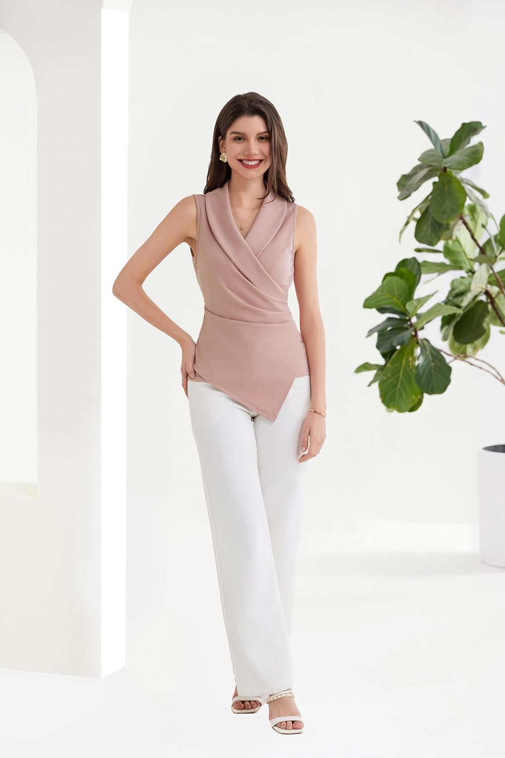 Business Wrap Surplice V Neck Spring Ruched Sleeveless Asymmetrical Blouse Top 2024 Sleeveless Work Tank Shirts 2024 Sleeveless Work Tank Shirts