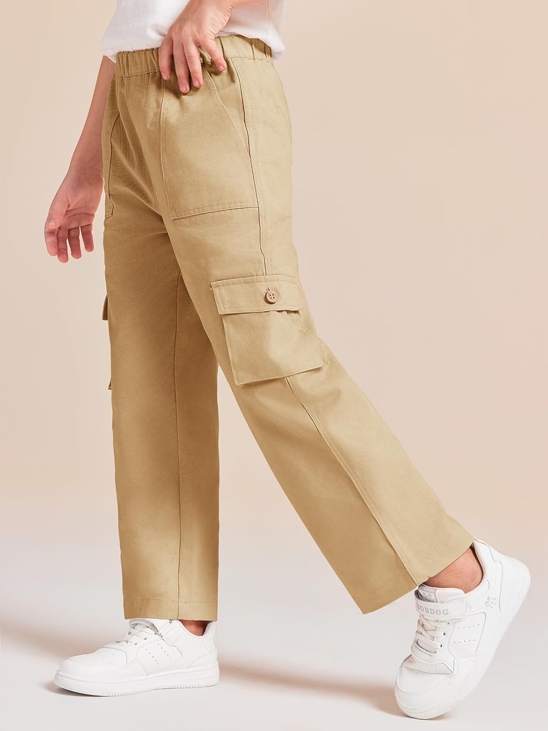 Haloumoning Girls Cargo Pants High Elastic Waist Kids Straight Leg Twill Trousers with Pockets 5-14 Years
