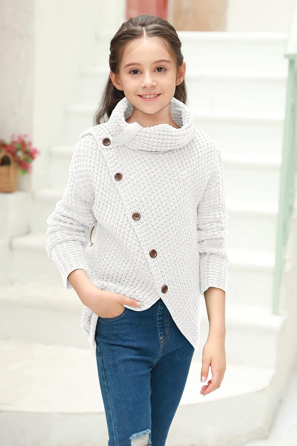 Haloumoning Girls Sweaters Button Turtle Cowl Neck Asymmetric Hem Wrap Pullover Sweaters for Girls