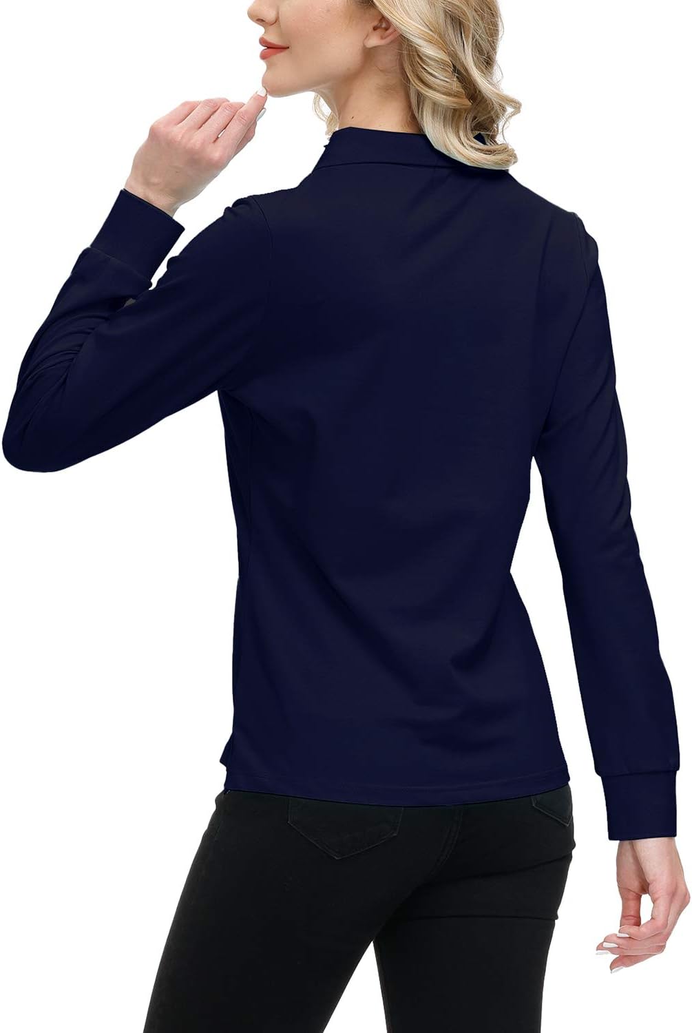 Sport polo shirts for women with long sleeve,solid color,fashion welt collar, classic v neck with zipper closure.Tag-free neck label with unique logo design on chest. Fabric