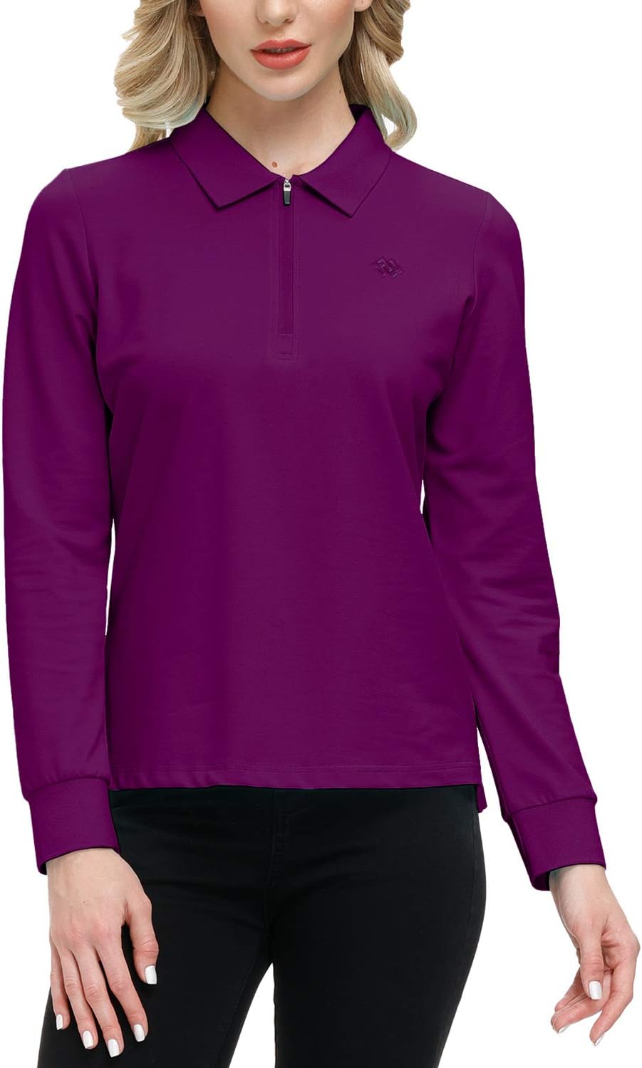 Sport polo shirts for women with long sleeve,solid color,fashion welt collar, classic v neck with zipper closure.Tag-free neck label with unique logo design on chest. Fabric