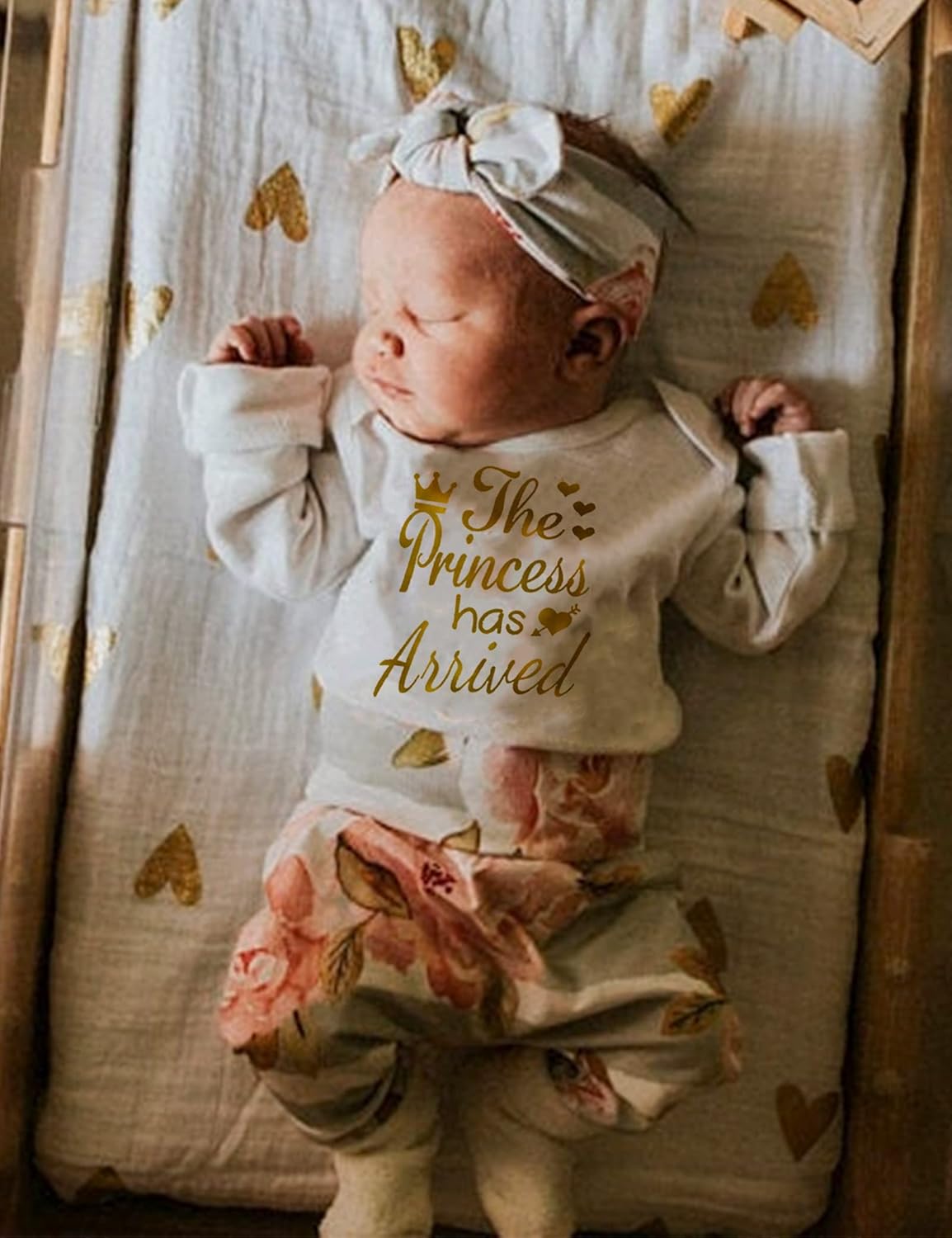 KANGKANG Newborn Baby Girl Clothes Hi I’m New Here Newborn Outfit Infant Romper Floral Pants Cute Baby Girl Outfits 4PC Set