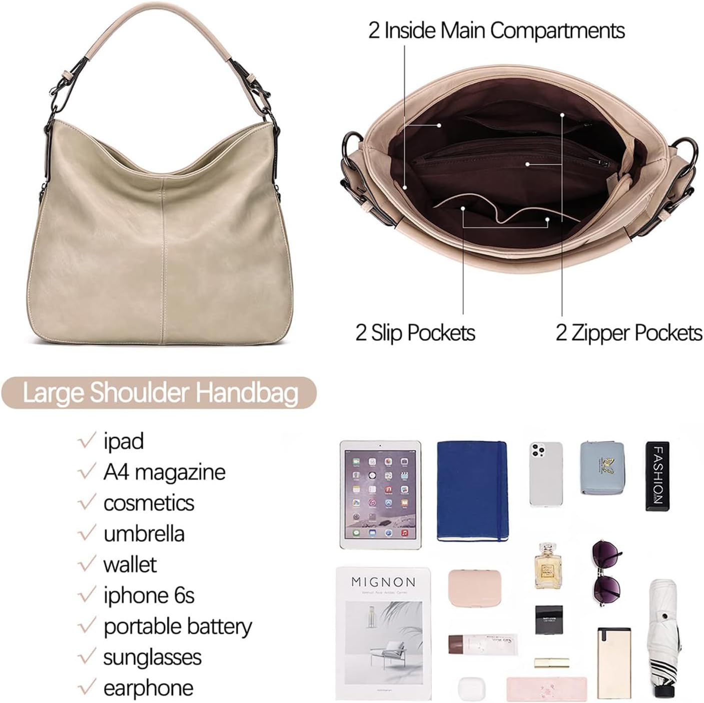 Main Compartment: Rommy space for women’s daily use, multi pockets for organize.Top zipper closure design can better protect your things from tumble out while you take items out.Can hold your iPad, books, cellphone, wallet, cosmetic, sunglasses, important cards, passport, and umbrella, etc.Great gifts for girlfriend, wife, mother, sister. Also Anniversary, Valentines Day, Birthday, Mother’s Day, Thanksgiving, Christmas.