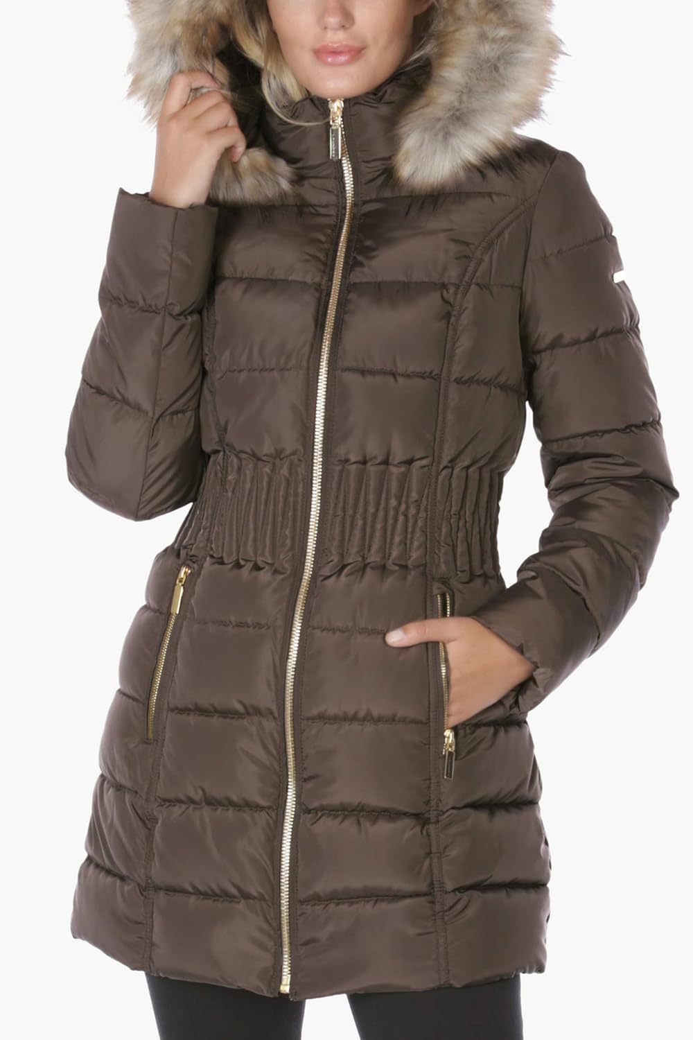 Laundry by Shelli Segal Women’s 3/4 Puffer Jacket with Zig Zag Cinched Waist and Faux Fur Trim Hood