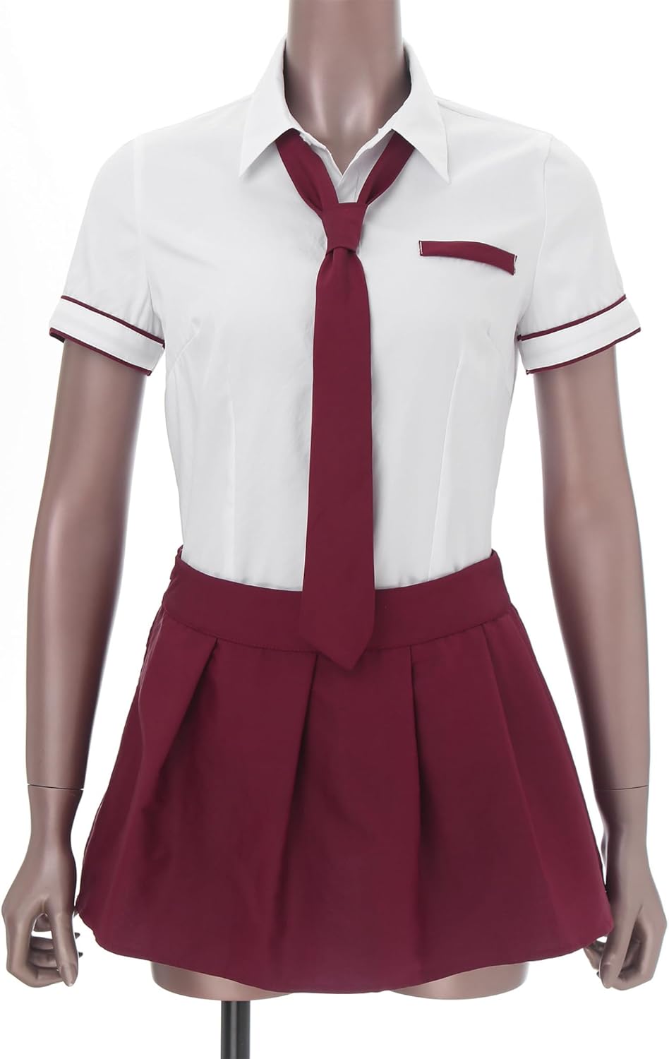 Linjinx Womens School Uniform Cosplay Set Short Sleeve Shirt with Tie and Plaid Skirt Halloween Fancy Dress Outfits