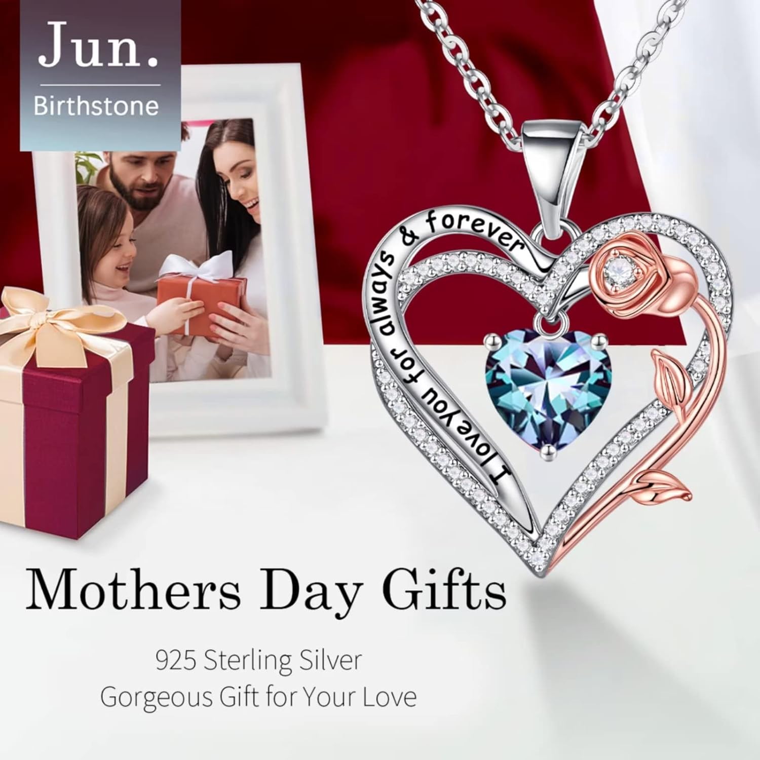 Memorjew Jewelry Gifts for Women – 925 Sterling Silver Rose Heart Birthstone Necklace for Women Birthday Jewelry Gifts for Women Wife Her