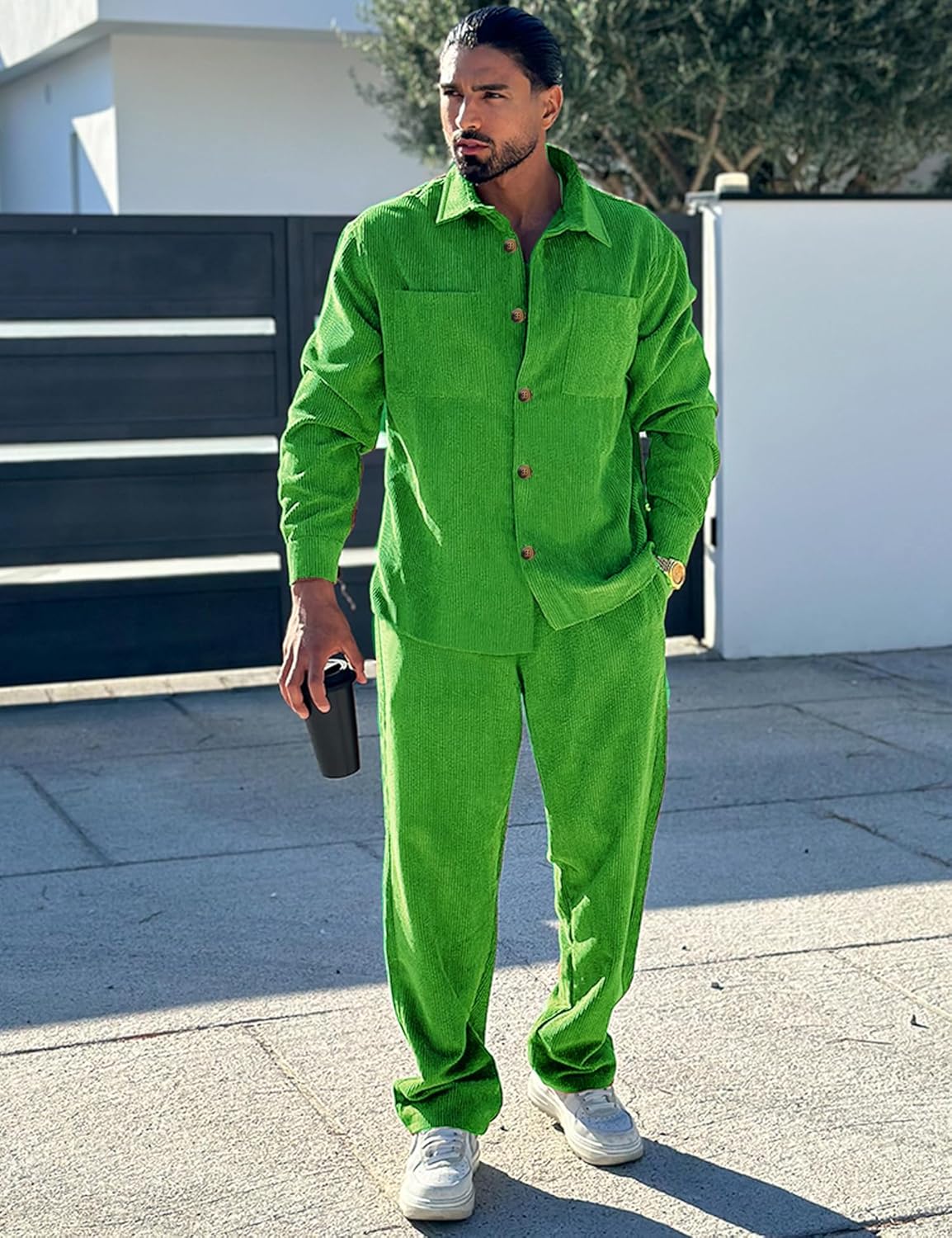 ZSJR Mens 2 Piece Outfits Corduroy Casual Long Sleeve Shirt Pant Sets Tracksuits
