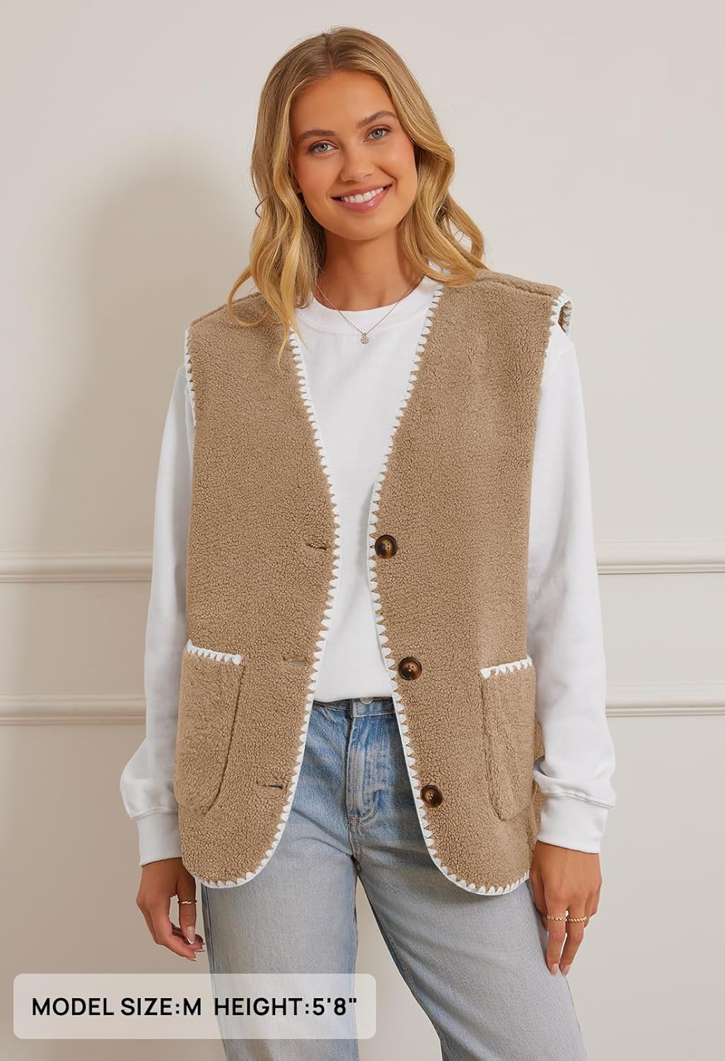MEROKEETY Women’s Fuzzy Fleece Vest Sleeveless Colorblock Sherpa Jacket Button Down Outerwear with Pockets