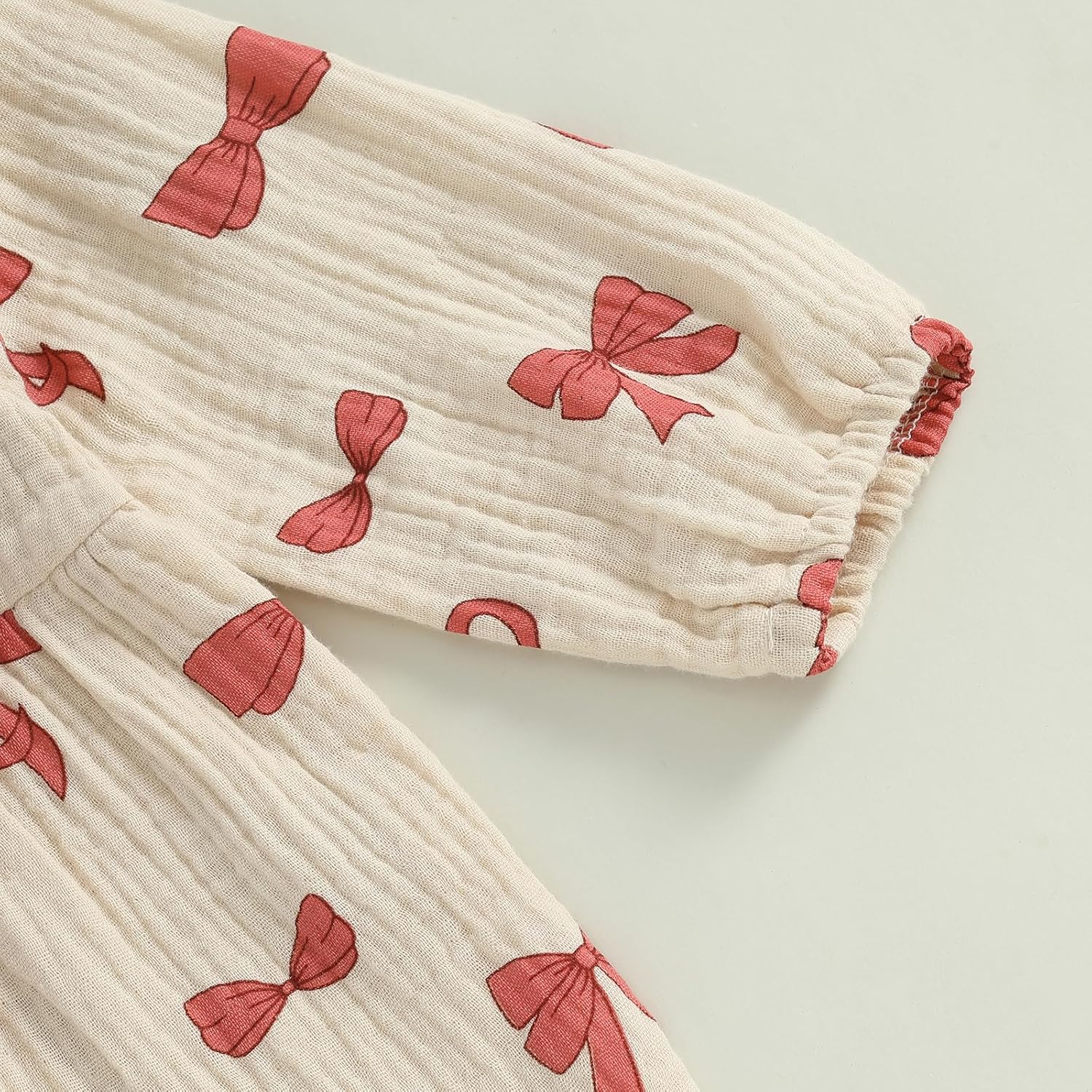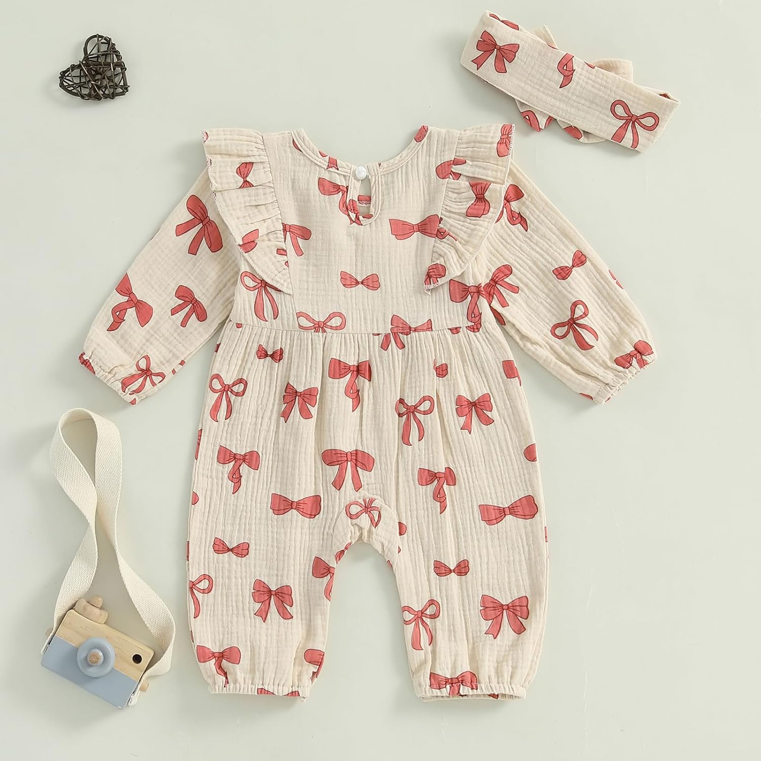 Baby Girls Rompers Bowknot Print Crew Neck Ruffle Long Sleeve Jumpsuit Infant Cotton Linen Fall Clothes with Headband