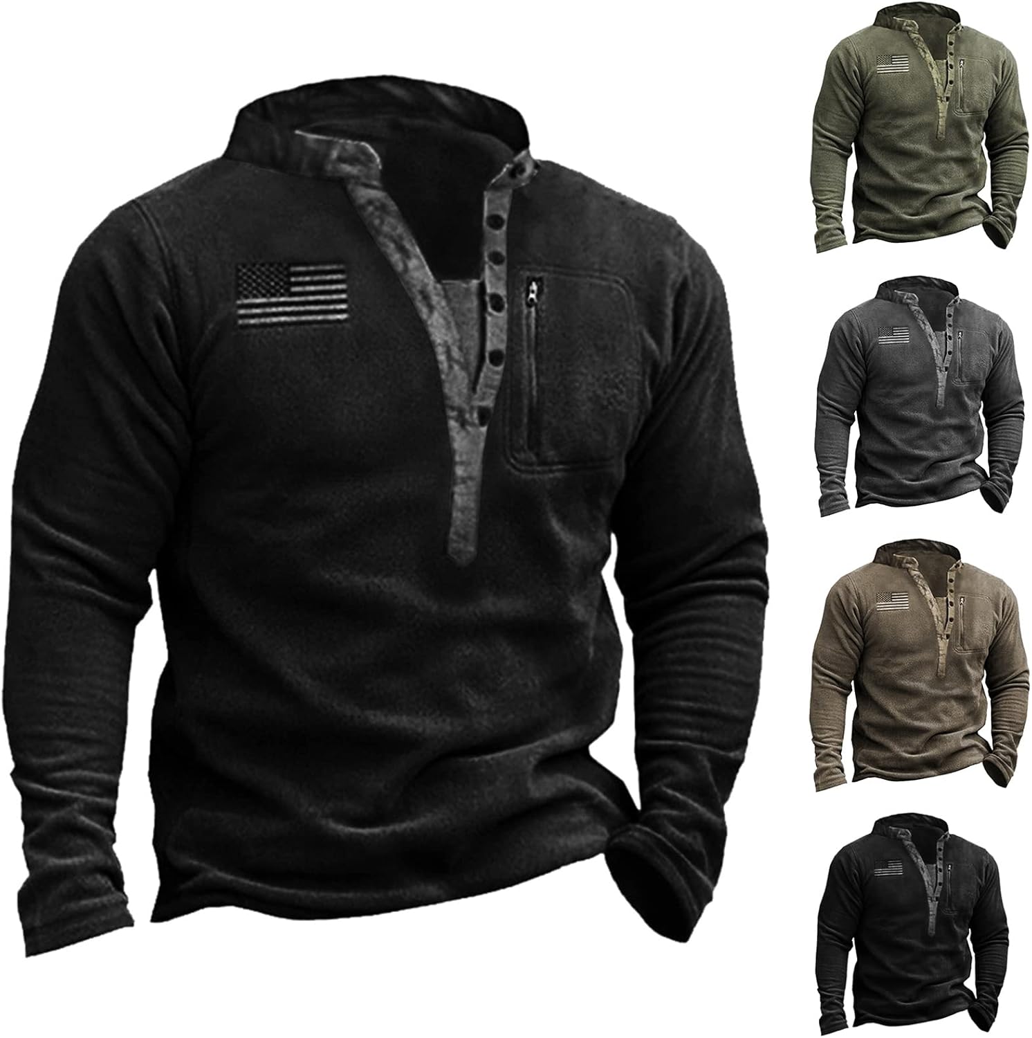 Parise 2023 Vintage USA Flag Logo Henley Sweatshirts for Men Banded Collar Long Sleeve Button Up Hippie Tops with Zip Pocket