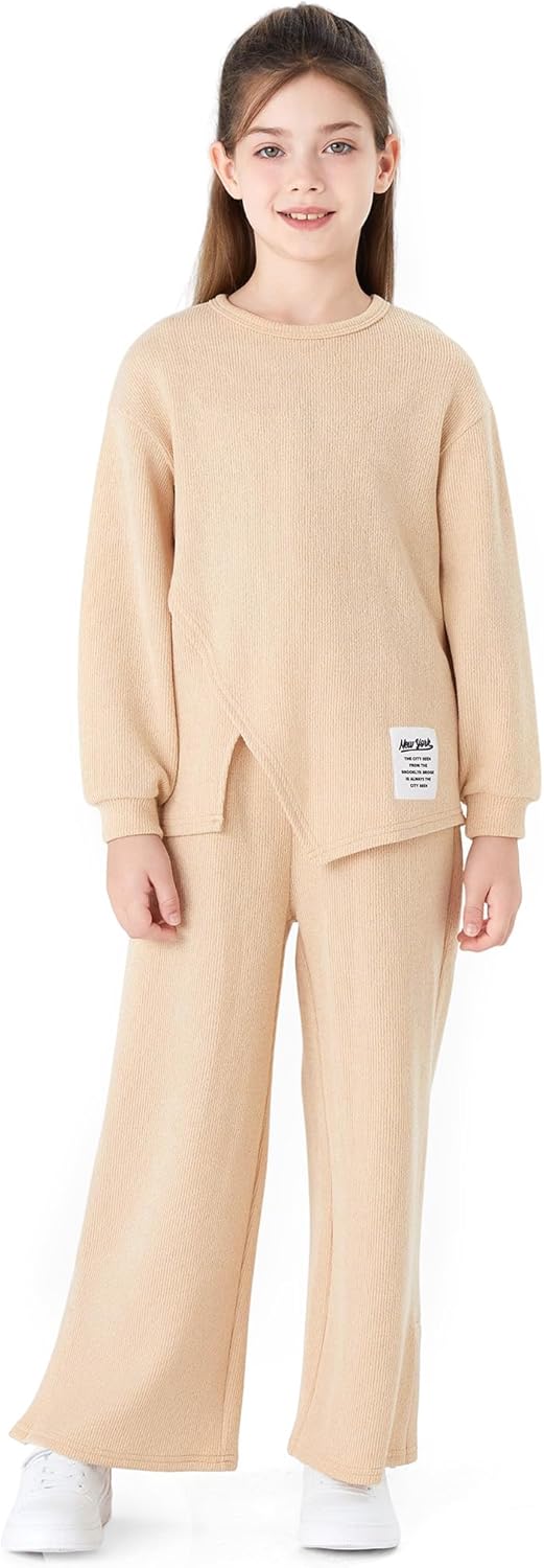 PATPAT Girls Pant Sets 2 Piece Fall Outfits Long Sleeve Clothing Sets, Crew Neck Knit Top and Wide Leg Pants, 5-14 Years