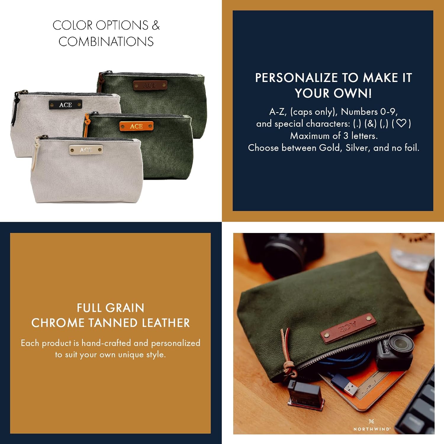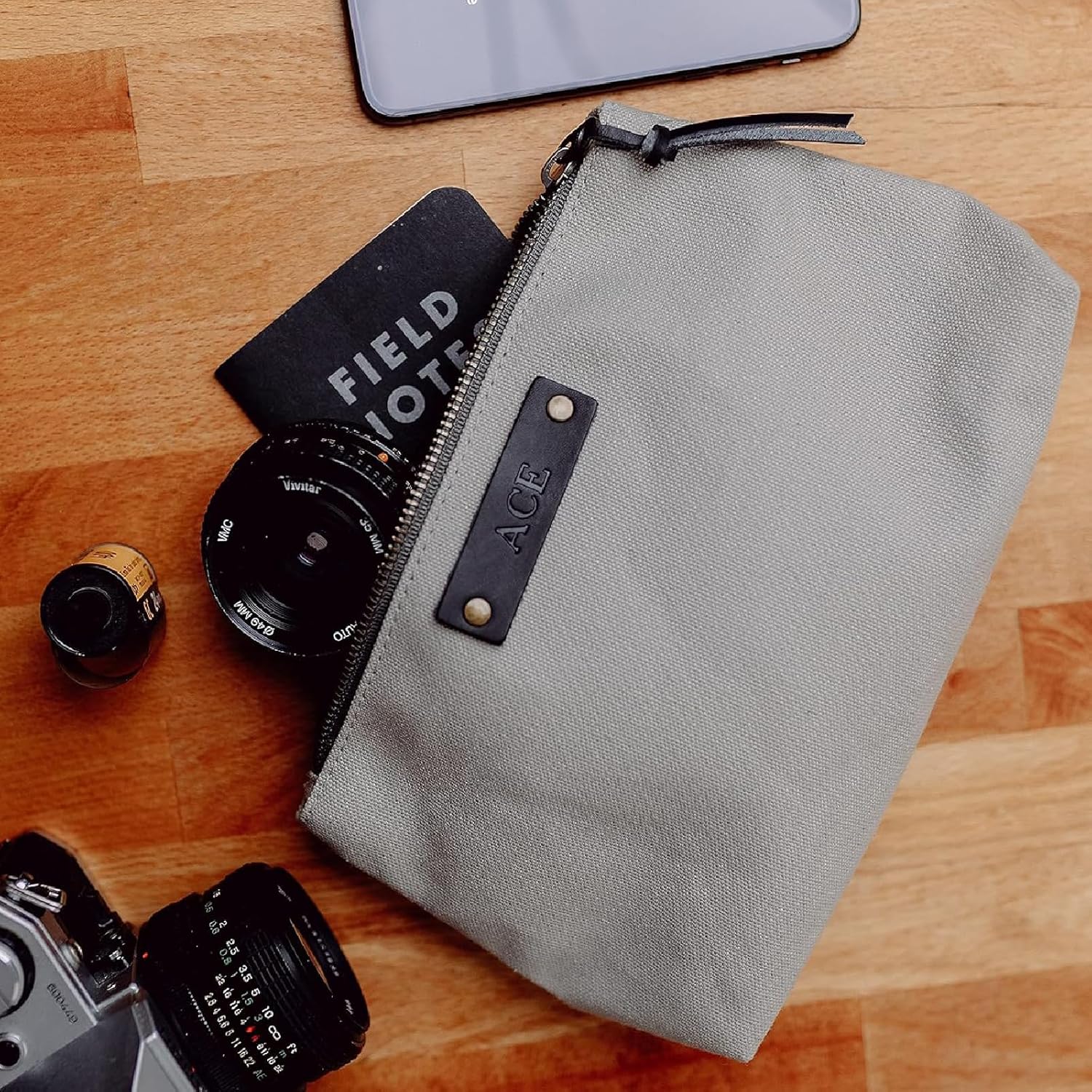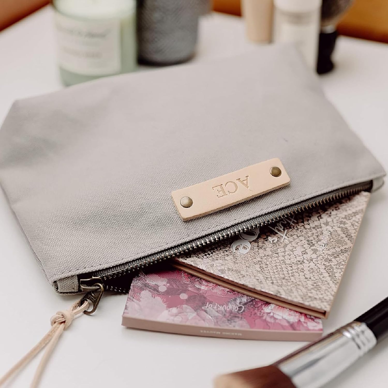 Personalized Canvas Cosmetics Pouch | Monogrammed Canvas Toiletry Bag | Cotton Canvas & Full Grain Leather | Reusable Canvas Storage Pouch | Dimensions: 8.5″ x 2.75″ x 5″ | Made in USA (Birch)