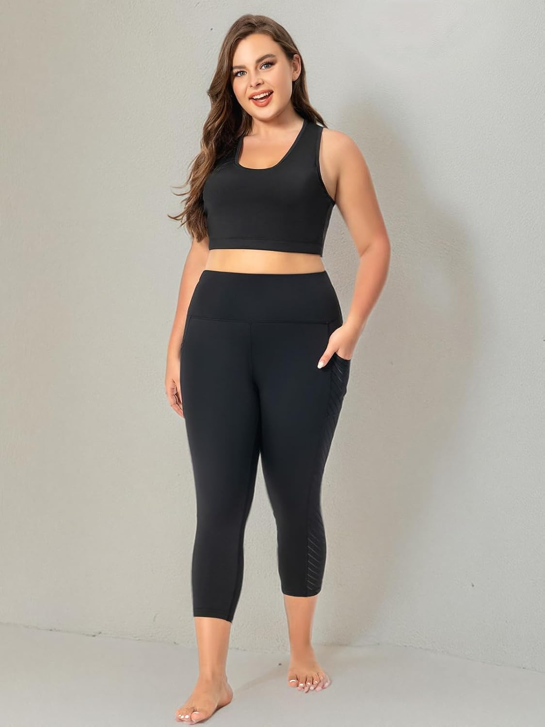 Plus Size Capri Leggings for Women with Pockets L-5X Workout Leggings Black Mesh Yoga Pants High Waisted Tummy Control