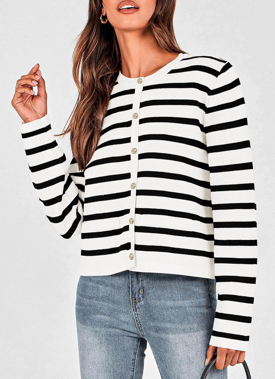 PRETTYGARDEN Striped Long Sleeve Button Down Open Front Women Cardigan Sweater