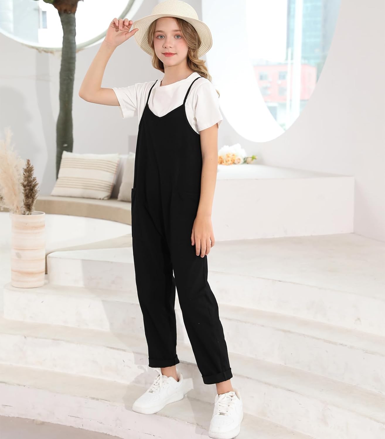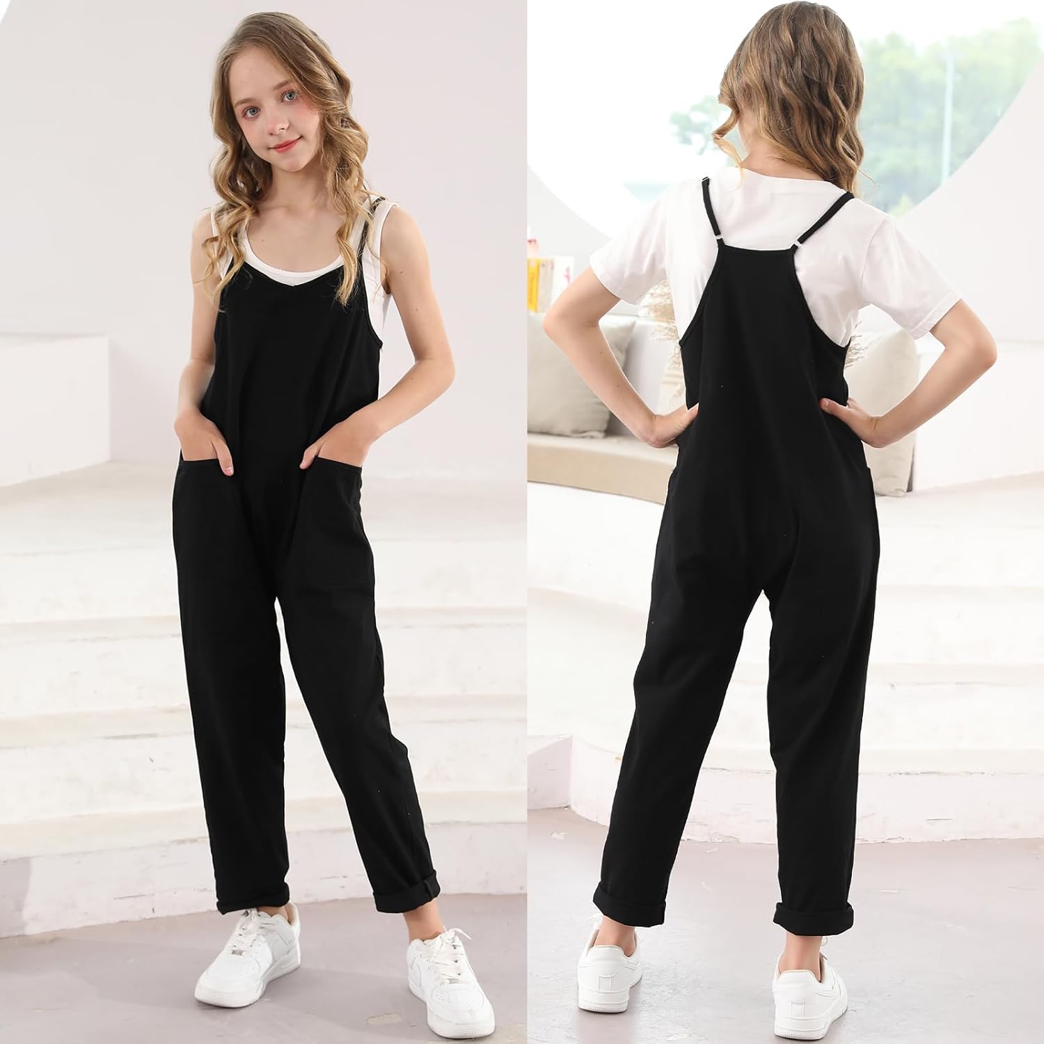 RAISEVERN Jumpsuits for Girls Casual Sleeveless Loose Spaghetti Strap Summer Rompers Long Pants with Pockets