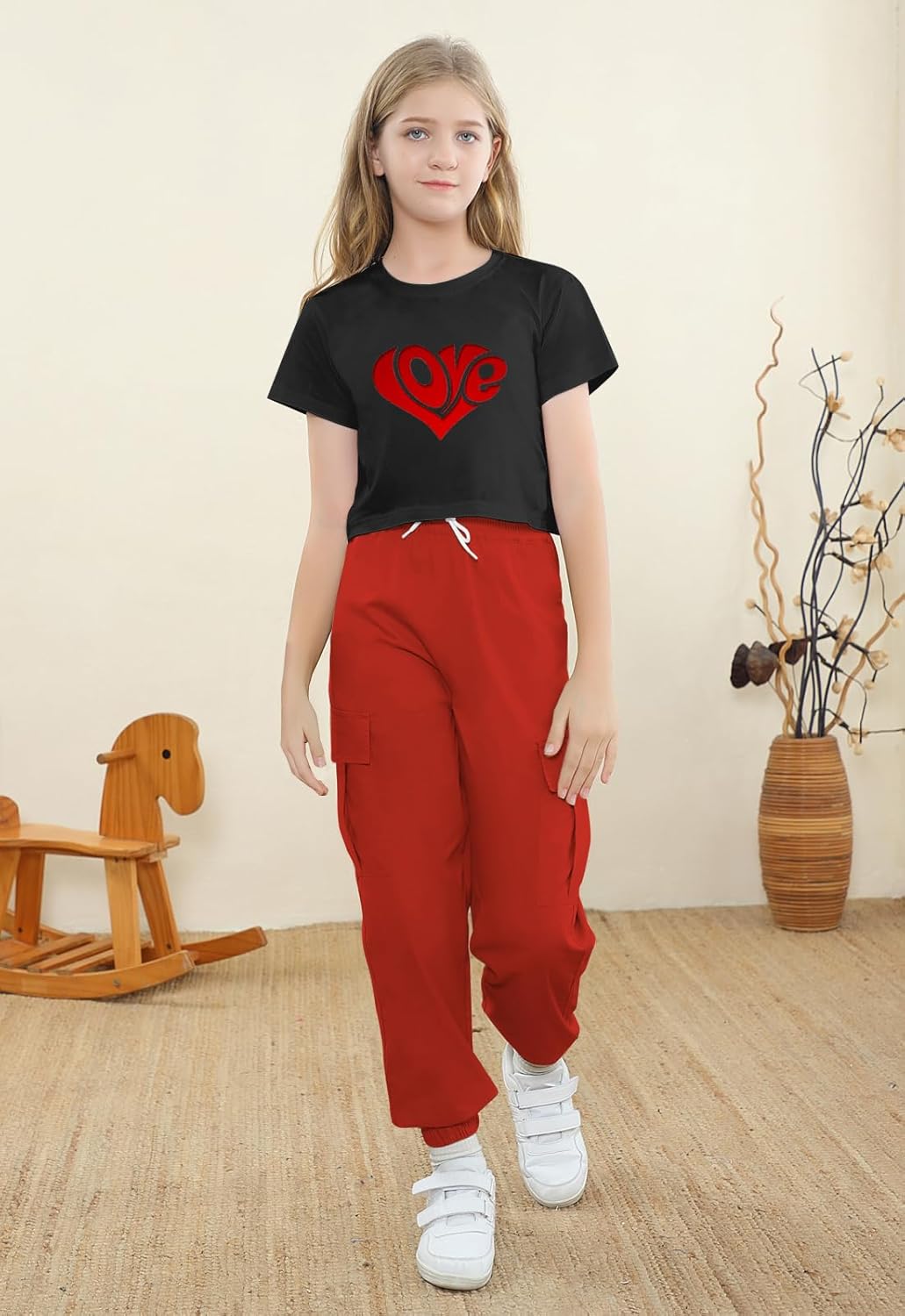 SANGTREE Girls’ 2 Piece Outfits T-Shirt and Drawstring Cargo Jogger Pants Clothing Set, 4-14 Years