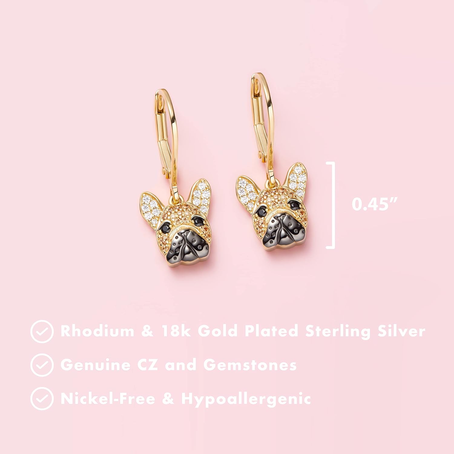 SCAMPER & CO French Bulldog Dangle Earrings for Women, 18K Yellow Gold & Gunmetal Plated Sterling Silver, Jewelry for Dog Lovers