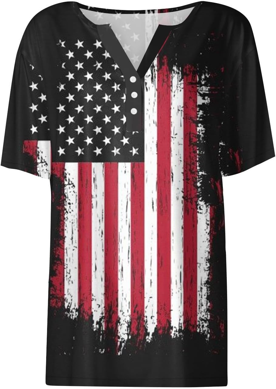 Summer Tops for Women 2024 Short Sleeve Button V Neck July 4th Patriotic Shirts USA Flag Independence Day T-Shirt