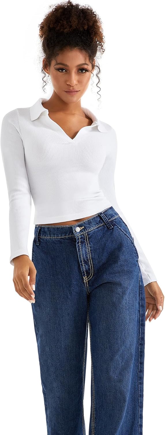 SUUKSESS Women Long Sleeve Ribbed V Neck Polo Shirts Collared Business Casual Slim Fitted Tops for Office Work