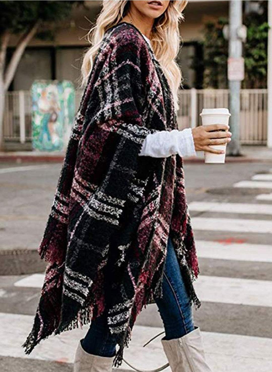 VIMPUNEC Women Boho Buffalo Plaid Poncho Pashmina Shawl Wrap Cape Sweater Knitting Cardigan with Tassel