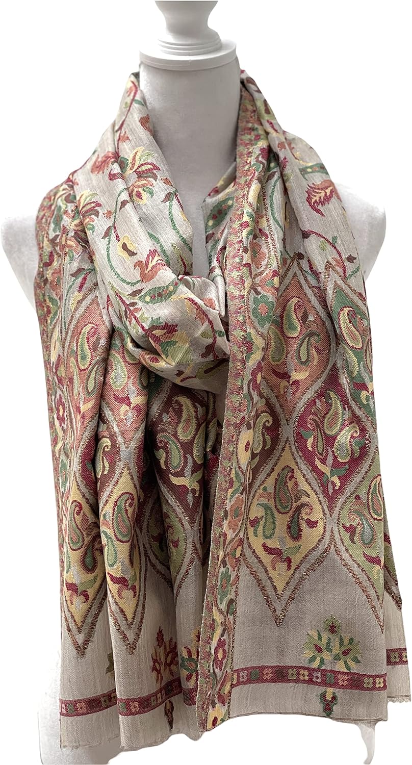 This wool scarf is adorned with delicate paisley motifs in the form of leaves, that come together to make mango like patterns on the wrap. With Stripes on the borders, this is a must have accessory for Fall/Winter. Amp up your Winter and Fall outfits.